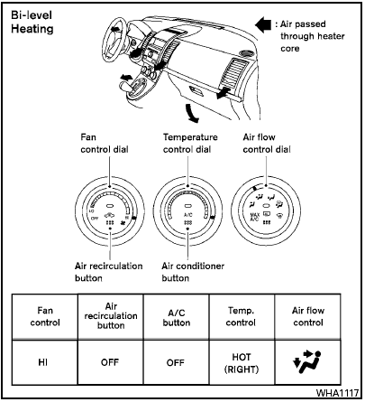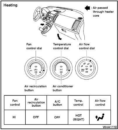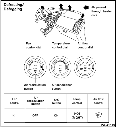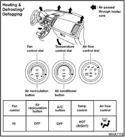 The following charts show the button and dial positions for MAXIMUM AND QUICK heating, cooling or defrosting. The air recirculation button should always be in the OFF position for heating and defrosting.